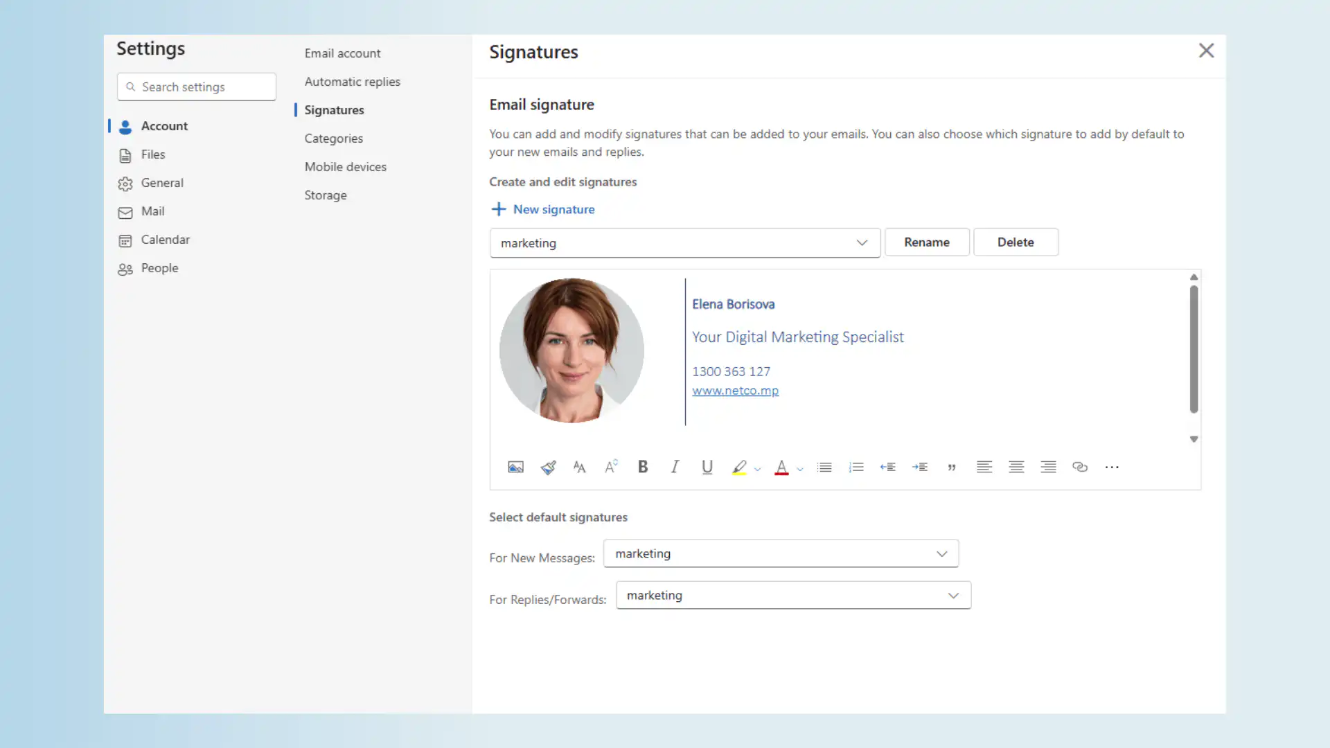 - Here, you’ll find the “Email signature” section where you can create and edit your signature.